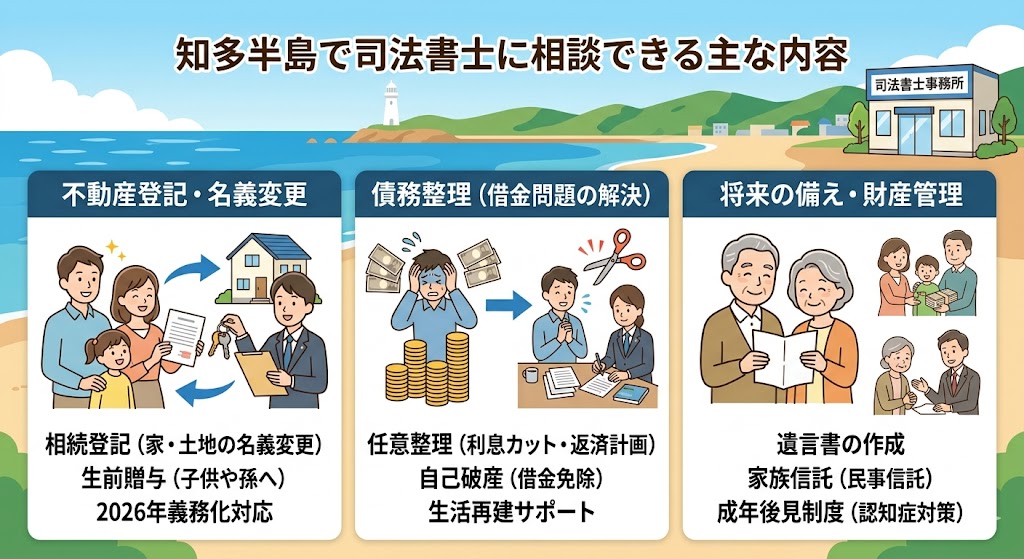 「亡くなった父の名義のままになっている土地を整理したい」「毎月の借金返済が苦しく、どこに相談すればいいかわからない」といったお悩みはありませんか?知多半島には、地域に根ざして活動する司法書士事務所が多く存在します。