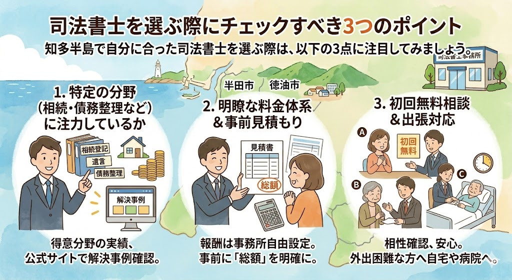 知多半島で自分に合った司法書士を選ぶ際は、以下の3点に注目してみましょう。